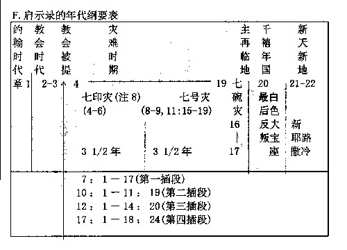 按此法,启示录第 4章起全书皆预言,待将来应验(虽有人曾把 2-3章的七教会也放在预言部分内,但这还算少数人士的意见)。4-19章指主再来前要应验的预言,即是指七年灾难时代,特别是后三年半之时。20-22章指主再来后之情形(此派学者有 Tenney, Walvoord, Ironside, Gaebelein, Scot, Alford, Zahn, Kelly等)。笔者赞同此法(注 6)。
