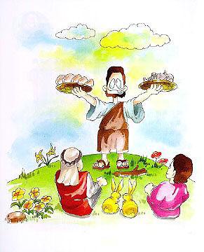 太阳快要落山了,只是人越来越多。耶稣想试一下腓力,就说:“腓力,我们到什么地方去买饼给这么多人吃呢?”腓力说:“就算有二百个银币买饼,也不够一人吃一口的。”这时,门徒安德列带着一个小孩子来,说:“他有五个大麦饼和两条鱼,不过,这点儿东西,哪里够这么多人吃呢?”