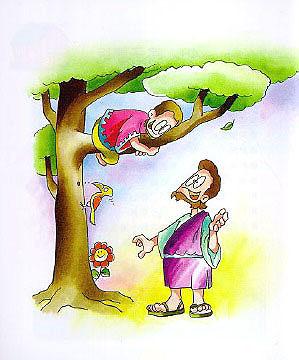 进入了耶利哥城,城里的人都跑出来看耶稣。城里有一个非常富有但名声也极坏的税务总长,名字叫撒该,他很想看看耶稣,但是自己的个子太矮人群挡住了他的视线,他怎样跷高脚、伸长脖子都看不见,只好爬上路旁的一棵大桑树,居高临下,等着耶稣经过。耶稣过来抬头看见爬在树上的撒该,就说:“撒该下来,今天我到你家里作客。”撒该由树上跳下来,兴高采烈地带耶稣往自己家里走,边走边诚恳地对耶稣说:“主啊,我愿意把我财产的一半分给穷人,从前我欺骗过谁,现在四倍偿还。”耶稣也高兴地说:“今天救恩临到这一家了。”