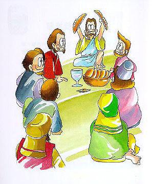 进餐的时候,耶稣说:“有一个人要出卖我,他正和我同桌进餐,这个人有祸了。”又说:“我一直希望在受难之前,跟你们同吃逾越节的晚餐,因为从今以后,我不再吃逾越节的晚餐了。”说完就拿起饼来,感谢祷告后擘开分给门徒,说:“吃吧,这是我的身体为你们献的,以后你们要这样做来纪念我。”又拿起酒杯来,祝谢后递给门徒说:“拿去喝吧,这是我为众人所流的血,也是上帝和人立约的血,从今以后我不再喝这葡萄酒了。”又说:“时候到了,你们都要离弃我。”彼得说:“就是所有的人都背叛你,我也不会。”耶稣说:“就在鸡叫以前,你要三次不认我。”