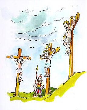 他们带耶稣去的时候,有一个古利奈人西门经过,他们就抓住他,让他背十字架跟耶稣走。到了一处名叫“骷髅头”的地方,他们把耶稣钉在十字架上。又钉两个犯人一个在左边一个在右边。耶稣祷告说:“父啊,赦免他们,因为他们所做的,他们不知道。”兵丁抽签分了他的衣服。犹太人的领袖们嘲笑耶稣:“如果他是上帝拣选的救主,能救别人,也可以救自己呀!”那同钉十字架的两个犯人中有一个说:“你不是救主么?救你自己和我们吧!”另一个就责备他,并说:“耶稣,请在你的国里记念我。”耶稣告诉他:“今天,你就跟我在乐园里了。”