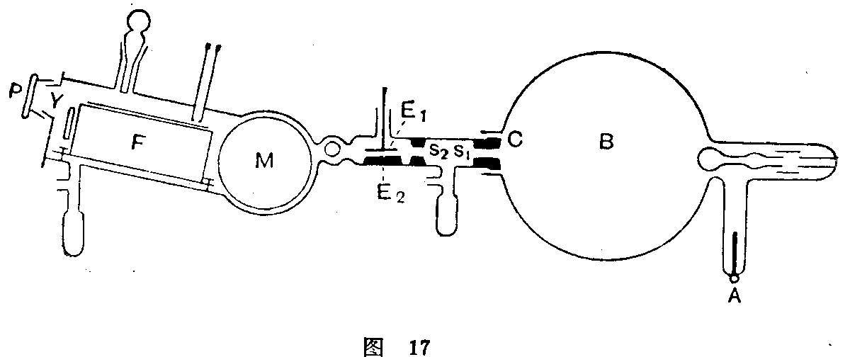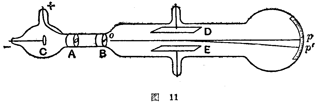 圖11表明湯姆生用來進行上述有歷史意義的實驗的儀器。一支高度抽空的玻璃管裝
