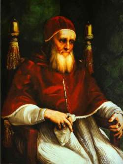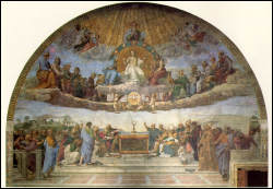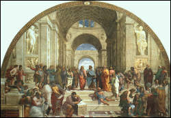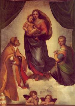 拉斐尔最著名的,就是他的圣母像。他的圣母寓崇高于平凡,是平民式的母亲,纯朴善良和蔼可亲,充满母爱与人情味,而圣母的背景经常是优美的田园风光,两个孩子在膝下玩耍,完全没有禁欲主义色彩,歌颂普通女性之美,他是透过圣母表现他人文主义的色彩。 拉斐尔的圣母美的不得了,这种美,是集中所有美女的特质,绝不可能在任何一个美女身上找到如此完美的形式。因此,拉斐尔又透过圣母,表达他的信念:他相信有一种理想美、这世间是有着绝对美的观念的。 这种和谐与理想的人文主义特质,在拉斐尔处理梵谛冈签字大厅的壁画时,则是用另一种主题呈现其面貌。 文艺复兴,是透过对希腊罗马艺术文化的研究,因而走出中世纪的美学概念的。 当时,学者们收集古文物、尤其是希腊罗马时代的艺术品,蔚为一股风潮。但也因此,很多希腊罗马神话、与希腊罗马哲学、随之走入基督教社会,对很多基督徒而言,这种基督教遭遇异教、基督教遭遇希腊罗马文化的冲击,一定是很激烈的。 也不知道是受时代影响,还是自己就具有这种特质,总之,朱力阿斯二世教皇,竟然本身就是个酷爱希腊罗马文艺的教皇,他必须要妥善处置这种信仰遭遇信仰、文化遭遇文化的状况。朱力阿斯二世虽然以独断好战著称,对艺术文化的宽容,却叫人吃惊。