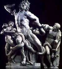 米开朗基罗一样是集雕刻家、诗人、艺术家于一身的典型文艺复兴时代的人文主义者。 他比达文西、拉斐尔都多了太多的冲突与矛盾。一方面他支持佛罗伦斯走向市民社会;但他的艺术支持者,却被迫是屡屡破坏市民社会的教皇。一方面,他受萨佛纳罗拉(自由传教者,曾短暂主持佛罗伦斯市政,典型清教徒思想,可算是中世纪思想的残存者)的信仰影响;但他骨子里却有艺术家热爱生命、自由的信念。一方面他爱佛罗伦斯;但他最重要的艺术作品,却都是出自罗马。他老是觉得有人要迫害他毒死他、相信自己一定活不久;但他却是文艺复兴三巨匠中,活的最久的,共活了89岁。 当劳孔父子雕刻(BC200-50)于1506挖出时,米开朗基罗亲临现场观赏。这个企图拯救特洛伊城而泄密、被诸神惩罚让大蛇咬死的孔劳父子悲剧,不知名的雕刻家将之雕刻的十分传神,从面目表情、到肌肉肢体的挣扎,全呈现出剧烈之痛苦与恐惧。 米开朗基罗深受这雕刻作品的震撼,而他早期的艺术作品,的确充满与上帝搏斗的意志。