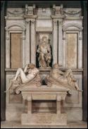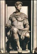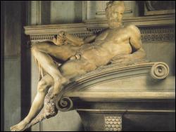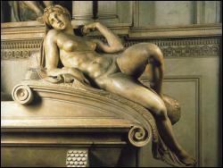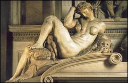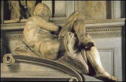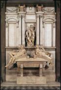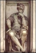 米开朗基罗将其郁闷不平表现于雕刻作品中。他雕刻了夜、昼、晨、昏四个人身像。其中以「夜」暗喻最强。 夜、昼之上的麦第奇‧朱良诺,手上拿着金币。晨昏之上的麦第奇‧罗伦左,左肘紧闭钱盖箱。他以这种方式讽刺征服者。 我们可以说,米开朗基罗早期中期的作品,这种充满人文主义的精神,是跟争取自由 ── 是市民的自由、也是艺术家的自由 ── 绝对相关的。他要搏斗的对象总是有权有势难以挣脱,正是因为这样,米开朗基罗的艺术作品才会有这么强的悲剧性他对上帝的理解,也是严厉不近情理的暴君。
