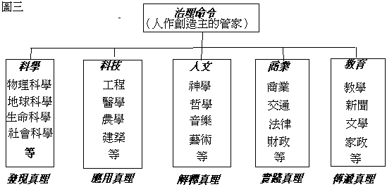 1.『起初上帝创造天地。』创1:1 2.『就造出大鱼和水中所滋生各样有生命的动物。』创 1:21 3.『神就照着自己的形像造人。』创 1:27 第一种是关乎物理世界的创造,第二种关乎生物世界,第三种是人的世界。关乎这三种宇宙的研究发展,可以分为物理科学,生命科学,及人与社会科学。 纯物质构成了一切系统的基础。那『有生命的动物』(希伯来文chay nephesh), 是一种加上生命的物质系统。而人则是加上上帝形像的生物系统。动物与物质系统,无论其如何复杂,在本质上是完全不同的。植物虽然是高级有机的化系统,但以圣经的观点说,并不具有生命。同样的,人,虽然又是物质又是动物,但在本质上因为有上帝的形像,又与它们有别。这样,这三种系统--物质,动物,人--乃是上帝原先赋予人使命中的三个特别对象。