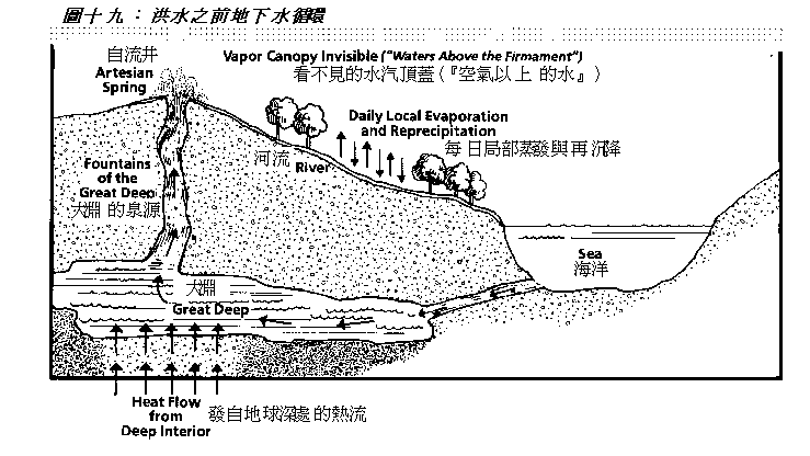 以上的描述显然是推想的,不完全的,因为圣经在这方面提供的详细资料极少。无论如何,我们可以有把握的说,上帝处理这些事是毫无问题的。既然,连作工程师的人,至少在原则上可以设计一个这种型式的有效系统,上帝当然可以。当然,那主要的成分是水与能。在深渊里有丰富的水的供应,在地球内的炉中有强烈的热。在此,显然有许多是猜想。但是在图十九中草拟的一些这样的系统,显得十分可能对那些反对的怀疑论者说,在现今的世界中,没有那种有压力的蓄水池,加热的水道,深渊的泉源,及水汽的顶盖。回答是圣经已将这事告诉我们:『当时的世界被水淹没就消灭了。』彼后3:6