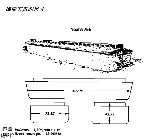 这方舟比通常三层楼的建筑物高,是橄榄球场的一倍半长。其总容量为1,396,000立方英呎。火车车箱有效容量为2, 670立方英呎,这方舟就有522个标准的火车车箱。它显然可以装载大量的动物,清楚地设计要容纳全世界的各种动物。因为一辆标准的车箱可以装载240只羊,这艘方舟就能装载125,000头羊。所有动物的平均大小,诚然小于一只羊,而今天存活在世的动物种类(鸟类,哺乳类,爬虫类,与两栖类动物)不到18,000种。陆地动物化石的种类甚至更少。因此,方舟实在已经够大了。