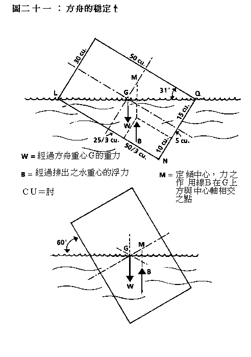 但是,现在这两个力量,并非作用在同一条线上。重力W经方舟剖面的中心点垂直向下作用,而浮力B则经过LQN三角形的中心点向上垂直作用,因为那一点是方舟所排出水量的重心。这两个力量W与B,形成一股偶力,其强度等于这两个力的任何一个乘二者之间的距离。只要B力作用线,以方舟下沉的方向说,位于W作用线之外,这项偶力就是一种『扶正偶力』,其作用会使方舟恢复为正的位置。这项偶力的大小,并不特别令人关心,但是那『定倾中心』(metacenter)M的位置,却是重要的。只要M在方舟对称轴上高于G(方舟剖面中心),船就会安稳。