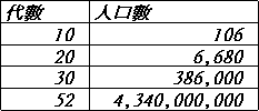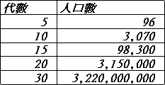 最后的数目字几乎与现今的人口相等。因此,在这些条件下,只有30代,就能达到今天的人口数目。第31代的人口数目为65亿。
