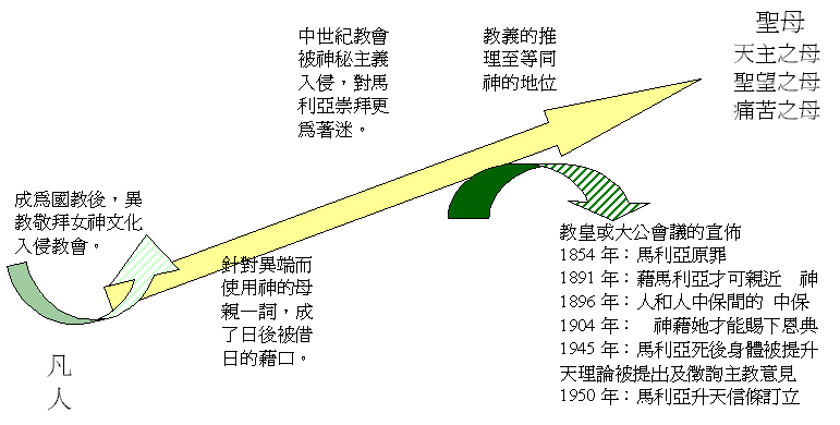 3)圣母的迷恋 a)不住的高升 i)自罗马君王奉基督教为国教,但同时也令异教敬拜女神的色彩;被带入教会中,为 后世留下了危机的伏线。(女神的敬拜最早源自宁录的妻子) ii)主后四三一年,以弗所大会议为针对异端,而强调主耶稣的神性,从而发明了“神的母亲”这名词,成为日后天主教借用的籍口。(当时所强调是证明主耶稣有神人二性) iii)中世纪时,天主教会的腐败而进入神秘色彩,撒但乘虚而入,制造许多与马利亚有关的灵验神迹,使人对“她”更狂热的敬拜,亦使“她”的地位不断提高。(这些灵验神迹使人更不注意基督,岂是 神作工的法则呢?因基督是被父 神所高举的。) iv)今天更发展至敬拜马利亚的像,及向马利亚祈祷(以由仁慈之母转求公义的父)。并从所用的念珠看到,每一圈要念信徒一次、六次天主经、六次圣三光荣经及一次欢喜五端,但却背五十三次圣母经。天主教每年有八个节日、两个月(五月是圣母月,十月是玫瑰月)及每星期六都是特别恭敬圣母的日子。并且天主教以“每个特敬圣母的地方均是朝圣的好去处,天主曾赏赐许多恩宠,以表示他嘉许这种朝圣。” 辩正:圣经中没有叫人敬拜马利亚,也没有明显或暗示马利亚的地位超越。 “进了房子,看见小孩子和他母亲马利亚,就俯伏拜那小孩子,揭开宝盒,黄金乳香没药献给他。”太二:11──是拜小孩子、却不马利亚,献给小孩子却不马利亚。而且圣经论及主耶稣时,马利亚的名字总是在后面。 b)不争的事实