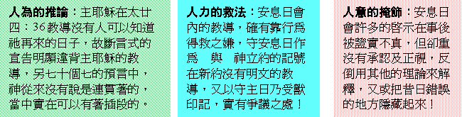 2)变更的立场:曾对安息日会作出深入研究的基督教学者,先判别安息日会为异端,后却更改其立场,使得基督教界内产生对立的阵营,影响至今仍未平息,有的接纳安息日会为正统教会,有的仍坚持其保守立场。