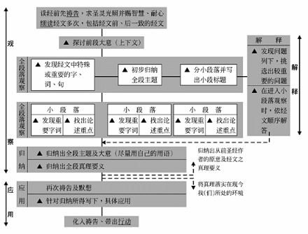 二、如何预备福音性小组查经? 圣经四种主要文体中,论述性和叙述性经文最适合福音性查经,诗歌体和启示性经文较为困难。因此,底下将根据本书第三课所讲解的原则,先整理论述性和叙述性经文归纳法查经流程,再藉作业及答案举出实例。 1. 论述文归纳法查经流程(查小段经文) 说明