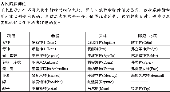 下表显示三个不同文化中诸神的相似之处。罗马人吸取希腊神话为己有,但挪威的诸神则为独立创造出来的,与前二者不完全一样。值得注意的是,它们都有父神、母神以及实现他们文化中所有理想的爱子。