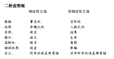 对真理有两个基本观点。有人认为:真理是与事实相应的;另有人认为:只要一个观点首尾连贯,能构成一套内部一致的陈述,它便是真的。前者是说真理应与事实相应,也就是「依样画葫芦」。后者则将真理比拟作悬在空中的一张蜘蛛网,认为它本身的关系网(network of connections)便足以支持它。好像一条链子,每一个接环都倚赖其他的接环才能联络在一起。