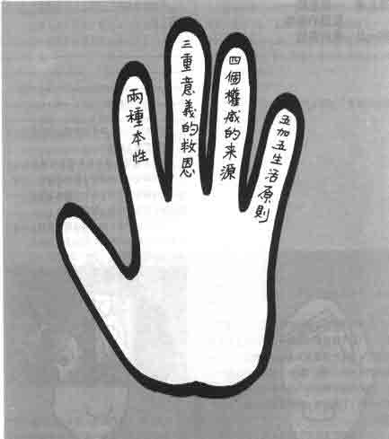 亚洲人用手指数算数目时,常把大姆指称作第一,意思就是开始,是完整的开始。还记得那幅「手的图解」吗?大姆指代表______,而手的全部代表_____________。