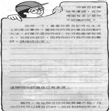 「我所认识的自己」表达你并不十分认识自己是个好方法,是吗?太多的价值观「像街上病菌」般被检拾来的,所以,除非你认识它们,否则生命中有些部分是你不能献给他的。