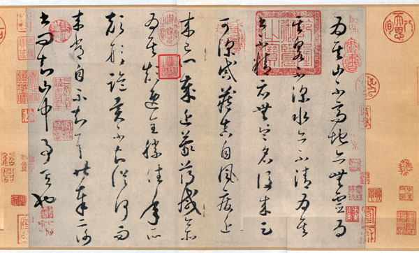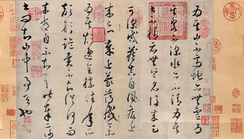 怀素的狂草,把篆书,隶书,蝌蚪文,虫书,稿草,章草,飞白等笔意容纳在其中;所以有人说:狂草的瘦劲朴野,则出于虫,篆;点画波发则出于八分;转换背向则出于飞白;沈著痛快则出于章草。