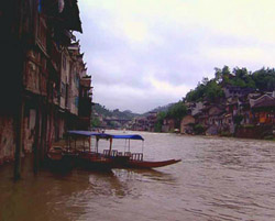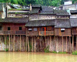 靠河一边的居民,一半建在山坡上,一半伸入水中,房屋就靠几条长长的木柱支撑著。木柱的影子反映在水面,线条就更富诗情画意,龙副州长说:“这些就是有名的吊脚楼。夜间,这儿常有晚归的渔船,几点灯火,迷住了多少岸上人家。端午节的龙舟也在这里大赛,锣鼓喧天。河在中国的文化史上,就像人体中的血管,流著生命。从前这里是官道,多大的官,也要下马停顿,然后才能上船。