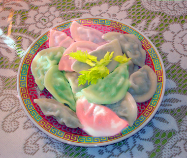 饺子是北方的家常食品,尤以新年期间最为流行;现在已经渐普及于南方,成为大众喜爱的面点。岁暮天寒,在温暖的屋子里,可以与客人一面谈话,一面包饺子,煮熟热食,增加团契的气氛,更有乐趣。三色水饺是在和面作饺皮的时候,其中分别加打细的菠菜和红甜菜根(Beet Root,鲜者煮熟,或用罐头者均可),成为绿色和红色,加上原来白色的饺皮,称为三色并陈,不仅美观适口,且富于营养。
