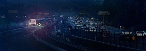 列车驶出地道,在架空的轨上奔驰。天边灿烂的朝阳,呼喊心中的沉重。