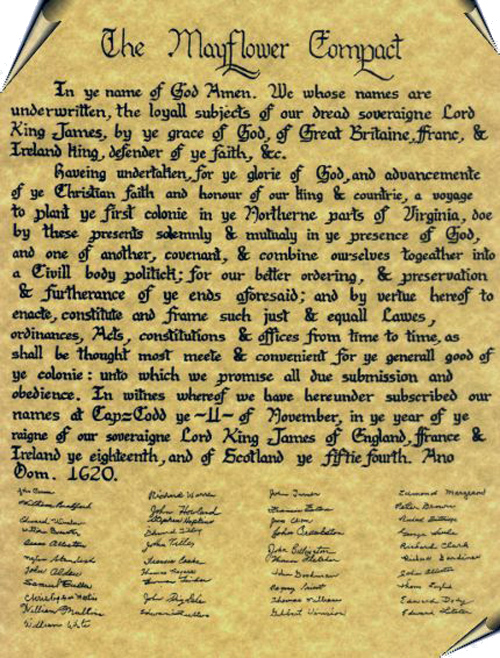 奉神的名,阿们。我们签名的人,是靠神恩典可敬畏的大不列颠,法兰西,爱尔兰王雅各,真理护卫者的忠诚臣民。我们此次航行的目的,是为了神的荣耀,促进基督教信仰,并我们王与国家的荣耀,在维钦尼亚北部,建立第一处殖民地。在神面前,我们庄严的同心合意,共同立约,合建一政治体制,以规律的保守并进展前述目标;并为此实施,组合,制订公义并平等的法律,规章,律令,条例,宪章,制度,随时随地,适当并便宜行事,以促进本殖民地的全体利益,我们应许为此竭尽忠诚与顺从。我们谨此签名为证。在鳕鱼角,十一月十一日,英格兰,法兰西,爱尔兰的王雅各在位第十八年,兼为苏格兰王第五十四年,主后1620年。