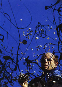 “整整五噚”,寻是海洋深度的度量衡,一噚合6尺或1.829米,仅就这个题目的含义,除了意指海水的深度以外,还意味著滴色的层次,语意双关。全画以蓝绿色彩主调,波洛在画上先是大面积滴注,然后按各区域的情况加洒深浅不同的绿色,再后是黑色油漆,最后再在表层使用铝漆,漆中还夹杂著不少“添加物”;同时还在某些他认为必须补色的地区浇滴一些醒目的白色和无光泽的色彩。波洛沿著画布边走边滴,让自身运动与滴色动作协调配合。我们从“整整五噚”上可以看到色线绵密得象网一样彼此纠缠著,有的地方密不通风,有的地方突然出现泛上来的蜜黄色。图上的局部即显示了两注稠厚的蜜黄色块,它似乎在白色乳性液体中流出来的缓慢色斑,还勾带著缓慢的紫色,因而成为全画的最亮点。