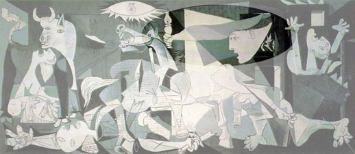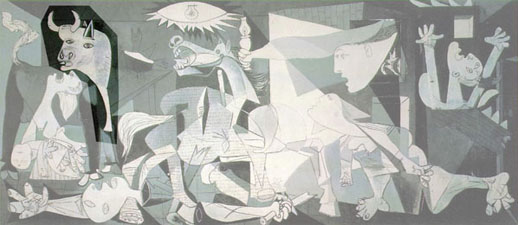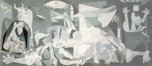 1937年西班牙内战其间,德国战机应西班牙国民军政府的要求,向巴斯克城市格尔尼卡猛烈轰炸,造成严重伤亡。毕卡索激于义愤,绘画了这有如炼狱般的惨状,著火的房子,惊惶失措的人畜,嚎哭的丧子之母,控诉著战争的残暴。为此,毕卡索与独裁者佛朗哥(Franco)决裂,流亡至巴黎,老死不还乡。