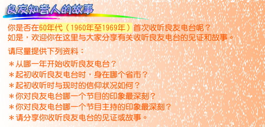 听广播虽然也有过许多的艰难和辛酸,也有不少的收获。从1981--2009年这28年来,凡我所传道的内容基本上都是从良友电台中学到的。无论是在我的人生道路上遇到的所有难题,或是在事奉中遇到的艰难,还有神学教义上的问题。神几乎都是透过良友电台给我解答。