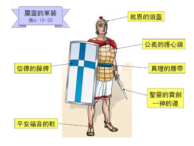 我們一一來看屬靈的全副軍裝:腰帶、護心鏡、鞋、籐牌、頭盔、劍。
