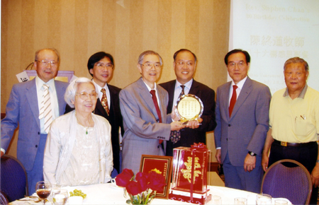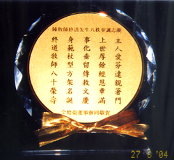 今年是本刊創辦人陳終道牧師的八十榮壽。在七月一日,陳家的兒女,為陳牧壽慶開感恩聚會。地點假列治文的希爾頓飯店。陳牧的生日是七月二日,因為七月一日那天是加拿大國慶,為了參加的人方便,把習慣上的暖壽,來慶祝壽辰。從各地和本地的來賓,約有二百五十人,有的遠從香港,馬來西亞,澳大利亞,美國等地專程前來。于中旻博士,朱志偉牧師,何衛中牧師和許朝英先生,代表本社,贈送水晶鐫刻金字的賀詞:
