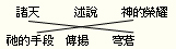 兩個句子的字詞有著相反倒轉的次序: (a)如果將兩個句子的字詞依原文次序上下並排,用線將第一句的第一個字詞連於第二句最後的字詞,再用線將第一句最後的字詞連於第二句的第一個字詞(在下面的例子裡,用線將第一句開頭的“諸天”連於第二句結尾的“穹蒼”(兩者為同義對應),又用線將第一句結尾的“神的榮耀”連於第二句開頭的“祂的手段”(兩者亦為同義對應),我們就會看見兩條交叉的線,所以叫做“交叉對偶” 詩十九1 |