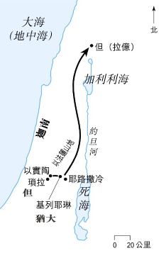 | 但支派的人往北方覓地居住 但支派的軍隊,從瑣拉與以實陶中間進入以法蓮山地,他們在那裡勸米迦家中的祭司跟隨他們。他們續往北行,來到拉億,殘酷地屠殺當地的居民,將那城改名為但,把那祭司帶去的偶像,變成他們敬拜的中心。 |