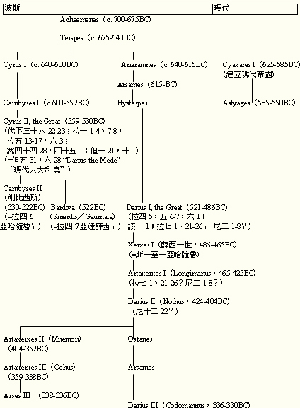 i. 薛西一世之後的波斯王為:Artaxerxes I (主前465-425年);Darius II (主前424-404年);Artaxerxes II(主前404-359年);Artaxerxes III (主前359-338年);Arese III(主前338-336年);Darius III (主前336-330年);